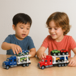 Estimula la coordinación ojo-mano al cargar y descargar los vehículos.