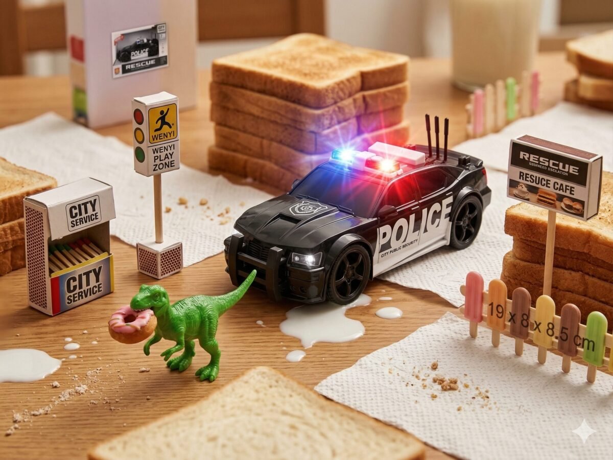 Descripción: ¡Atención, ciudadanos del cuarto de juegos! La ley y el orden han llegado. Esta patrulla de «City Public Security» a escala 1:20 es lo último en tecnología de persecución de peluches. Con un diseño negro mate súper intimidante y defensa delantera «anti-monstruos del armario», está lista para la acción. ¡Y no olvides activar las luces y el sonido para que todos sepan que la justicia está en camino!