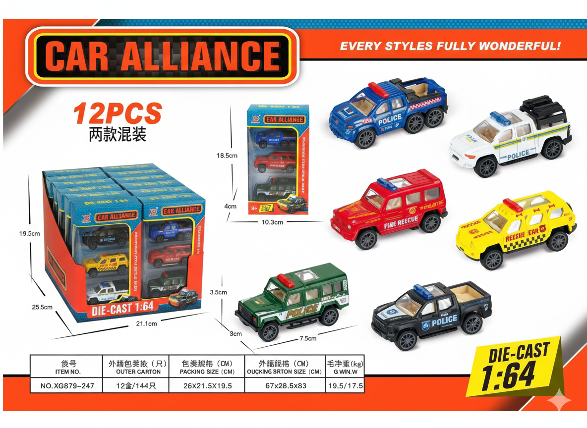 Descripción: ¿Por qué tener un auto cuando puedes tener doce? Este set Die-Cast a escala 1:64 es una flota completa de diversión. Ya sea el escuadrón de rescate (policía y bomberos) o el equipo de carreras, estos vehículos de metal son pequeños, resistentes y ultra rápidos. ¡Perfectos para compartir o para crear una persecución épica!