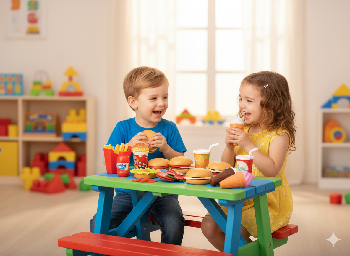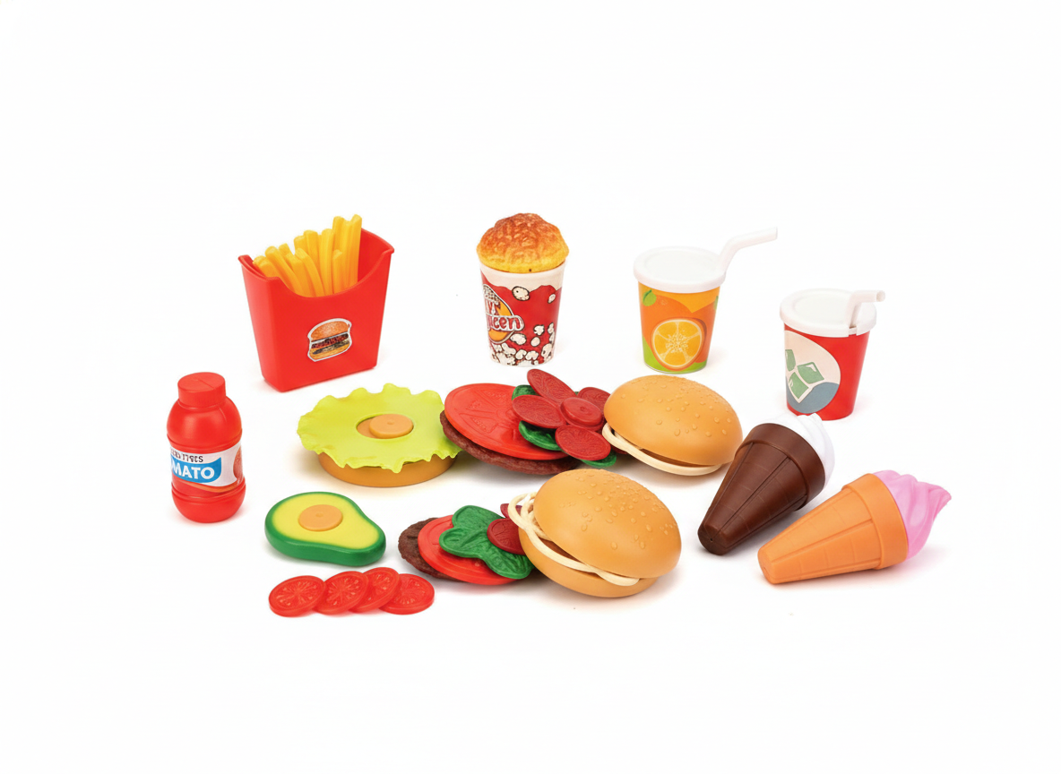 Este set de comida rápida de juguete es perfecto para que los niños se diviertan recreando su propio restaurante o momento de picnic. Diseñado para estimular la imaginación y el juego de roles, permite crear combinaciones de alimentos mientras desarrollan habilidades sociales y creatividad.