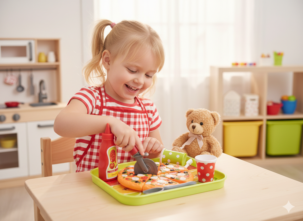 Descripción: ¡Transforma la sala de estar en la mejor pizzería de la ciudad! Este delicioso set de juego es perfecto para los pequeños entusiastas de la cocina que aman imitar a mamá y papá. Con un diseño vibrante y realista, este kit fomenta el juego de roles y la motricidad fina.