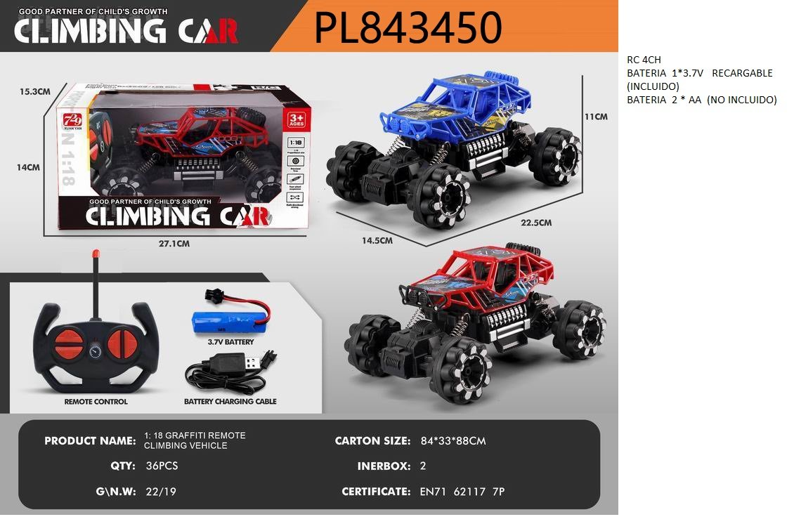 Descripción: (Modelos PL843449 y PL843450). Estos vehículos de escalada 1:18 no solo tienen un diseño de graffiti increíble, sino que sus ruedas están diseñadas para subir por donde otros solo lloran. Con control remoto de 4 canales y batería recargable, el único límite es la altura de tus escalones.