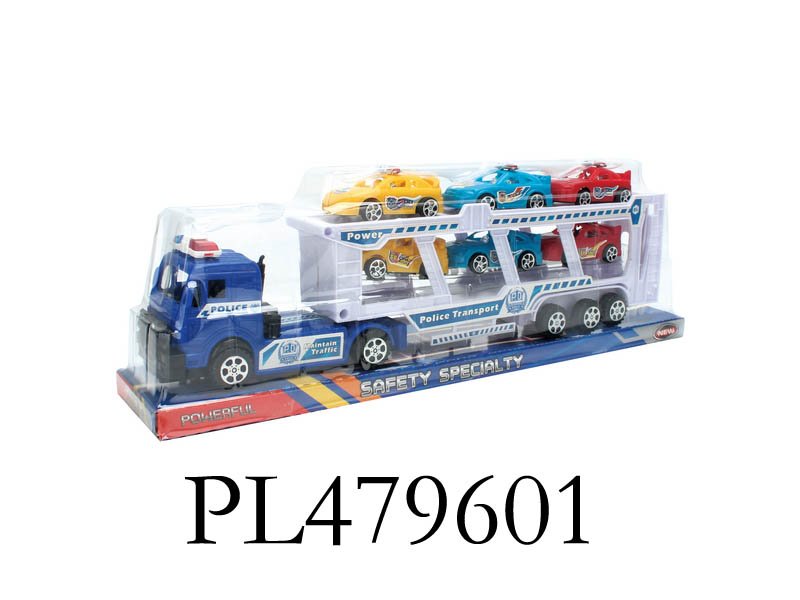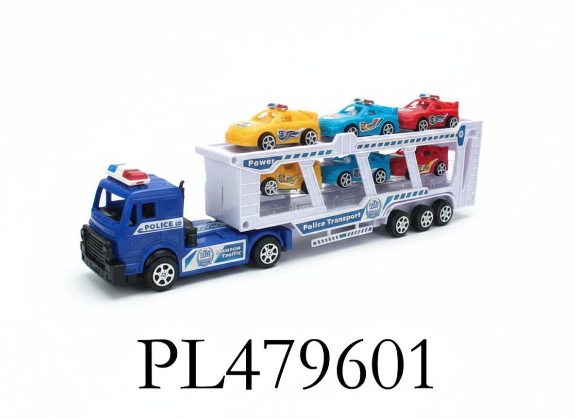 ¡Mantén el orden en la ciudad con estos imponentes transportadores de la ley! Equipados con múltiples niveles, estos camiones de policía en azul profundo trasladan una flota completa de patrullas rápidas listas para cualquier emergencia.