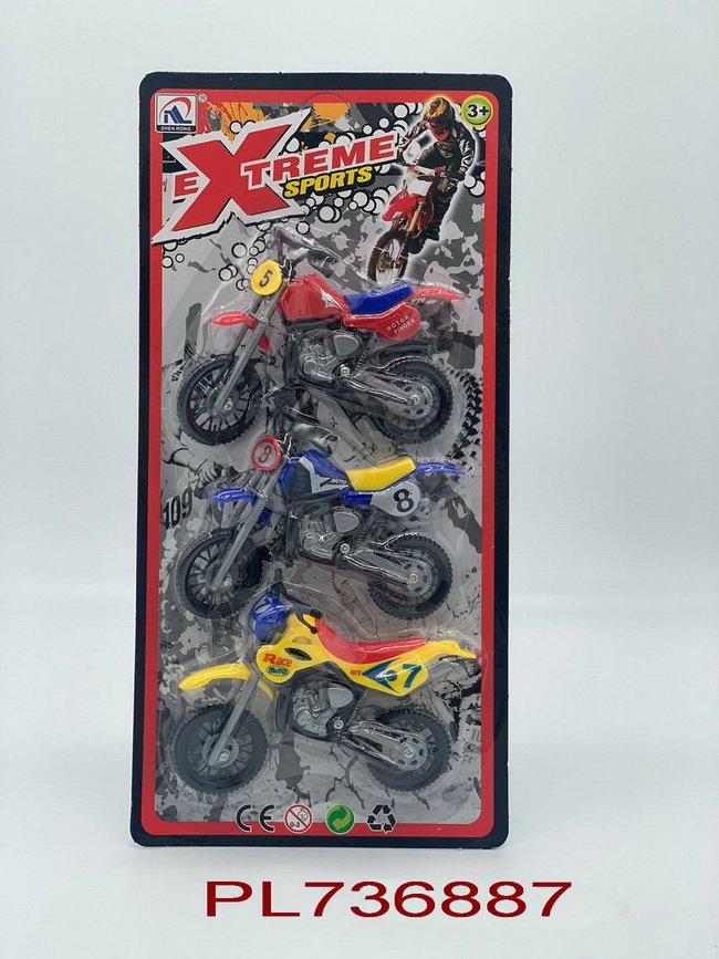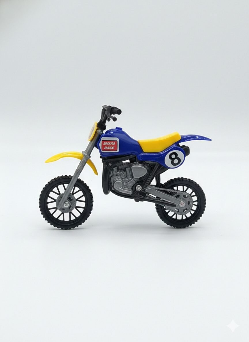 Tres motocicletas de motocross listas para desafiar la gravedad. Con colores vibrantes y calcomanías de competencia, estas motos del modelo ZR-2014-1 están diseñadas para saltos épicos. Su tamaño es ideal para llevar la competencia a cualquier lugar, desde el jardín hasta la mesa del comedor.